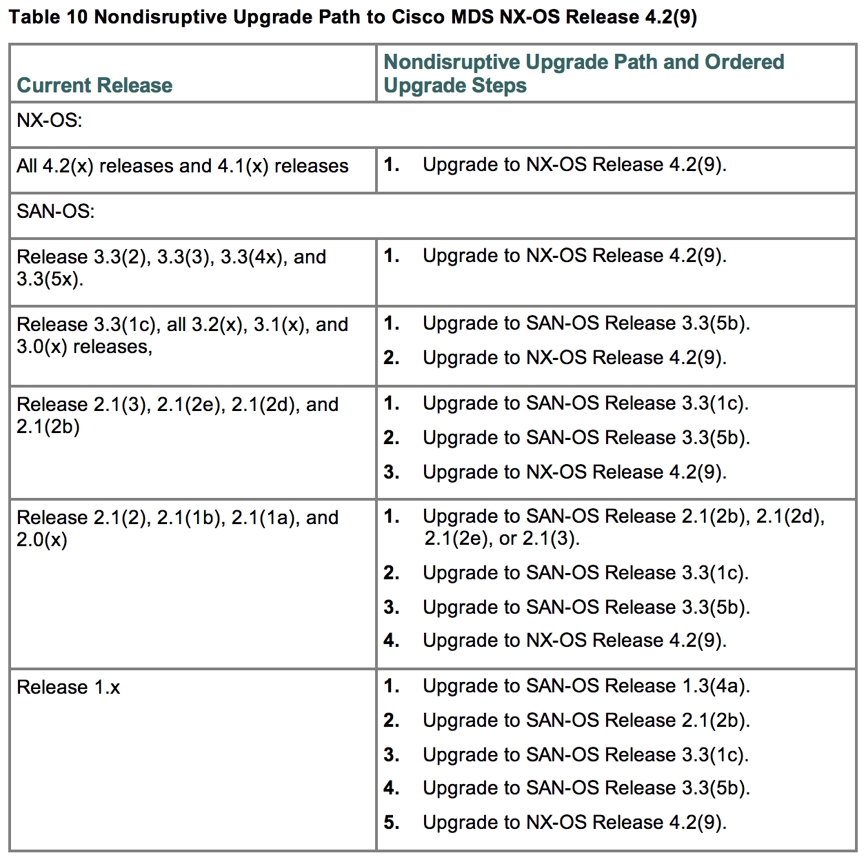 I’m running 3.0.2a, so according to the table below, I’ll first need to upgrade to SAN-OS 3.3(5b) before upgrading to NX-OS:
